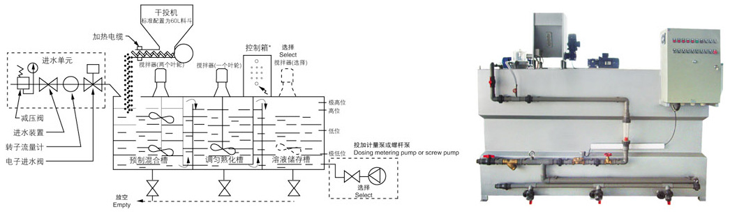 也有分批制備和投加功能的二槽式機(jī)型,或半自動(dòng)制備系統(tǒng),簡(jiǎn)易型溶液藥裝置。